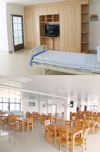 一层综合服务区,设迎客休息、接待咨询、医务诊疗、医技检查、功能复健休闲活动等区域,以及评估室、多媒体活动室。二层至七层设有套间,单人间,双人间,多人间等四种房型。每个房间均有氧气、独立卫生间和高清电视。卫生间内洗漱、淋浴、如便设施无障碍。